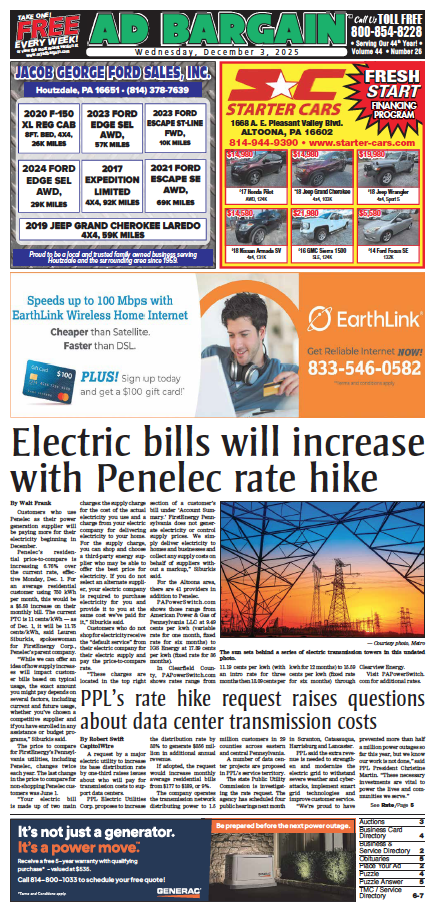 The sun sets behind a series of electric transmission towers in this undated photo. — Courtesy photo, Metro By Walt Frank Customers who use Penelec as their power generation supplier will be paying more for their electricity beginning in December. Penelec’s residential price-to-compare is increasing 6.76% over the current rate, effective Monday, Dec. 1. For […]