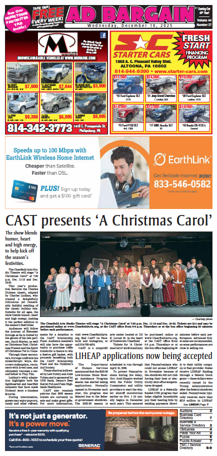 The Clearfield Arts Studio Theatre will stage “A Christmas Carol’ at 7:30 p.m. Dec. 11-13 and Dec. 18-20. Tickets are $14 and may be purchased online at www.ClearfieldArts.org, at the CAST office from 5-6 p.m. Thursdays or at the box office beginning 30 minutes before each performance. — Courtesy photo The show blends humor, heart […]